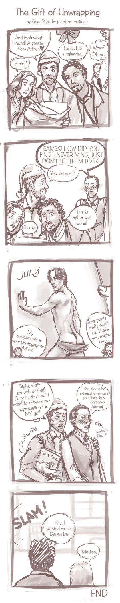 "I like July," Ariadne said as she removed the calendar from Arthur's stunned, slack grip. "You look really tan, Eames. Nice thighs." Yusuf leaned over to look too.